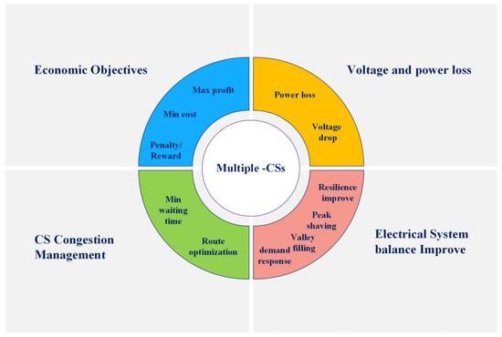 Regarding the coordinated management in multiple CSs in comparison with uncoordinated charging, several research works proved that coordinated strategies prevent technical system issues while optimizing different stakeholders’ benefits. In this regard, EV scheduling from the perspective of different stakeholders’ objectives for both the technical and economic aspects is evaluated in the recent research papers. In [53], a pricing strategy for every CS in each location is modelled to respond to EVs’ charging requests. The objective of the research works focused on multiple CSs referred to in this article are presented in Figure 7. In this regard, [55,56,57,58,71,72,73,77,79,80,81,82,83,84], for example, evaluated minimum cost and [52,53,54,55,56,57,63,64,78,81,82,85] focused on maximum profit of the charging station. Authors of [61,77,81,82] presented methodologies for optimal penalty/reward of EV charging/discharging. Improvement of voltage drops and power losses were given focus in [66,68,71,72,73,83], while refs. [60,65,70], incorporated energy users’ engagement in their studies in forms of demand response actions. Articles [57,63,70] studied improved loading of the network in terms of peak shaving and valley filling; [14,60,65] contributed to resilience improvement aspects. Authors of [51,54,56,61,83] focused on minimum waiting time while [55,56,57,61,78,79,82] considered route optimization related to congestion management of charging stations.