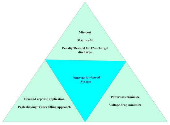 From the point of view of controlling management approaches, both centralized and decentralized schemes are applied in a system with EVs and aggregators as operators of EV charging managing. For instance, in [74], a multi-level hierarchical optimization model is proposed in the condition of worst-case SOC through a central aggregator’s decision-making. In [31], a centralized energy management algorithm for a CS is presented when an aggregator is responsible for the coordination of EV scheduling. In [78], an EV customer incentive pricing strategy is modelled to improve users’ comfort as well as minimize their charging costs. In [96], a centralized coordinated EV scheduling through an aggregator is developed when a combination of valley filling/peak shaving and charging costs is considered as the objective function. In this research, two modes of FC and slow charging are chosen according to the urgency of each EV in a public CS. Researchers in [102] developed a centralized EV scheduling by modelling a two-stage hierarchical scheme considering charging priority for EVs. In this research, actual and predicted residential EV loads and non-EV loads consumed are modelled in the valley filling optimization strategy. Authors of [100] developed a coordinated EV charging scheduling scheme under the control of an aggregator and urgency indicator for both home charging and public charging. Authors of [75] introduced an algorithm for EV scheduling in the residential and commercial areas, each one controlled with one aggregator. In this research, the aggregator’s responsibility is to optimize its own profit as well as provide demand response for DS and satisfy EV owners. Another demand response scheme through aggregators is implemented in [97] in a distributed game theory-based model. Moreover, in this research, financial benefits are optimized using an incentive price mechanism offered by each aggregator. Figure 9 shows corresponding objectives in an aggregator-based network. In this figure, for example articles [24,92,97] and [99] evaluated minimum cost and references [74,88,92,93,94,95] focused on maximum profit of the charging station. References [88,98] presented methodologies for optimal penalty/reward of EV charging/discharging. Minimum voltage drops and power losses were considered in [89,94,99,102,103]. Regarding the load management aspects, authors of [24,75,97,98] focused on demand response actions while [96,100,102,104,105] contributed to the peak shaving and valley filling.