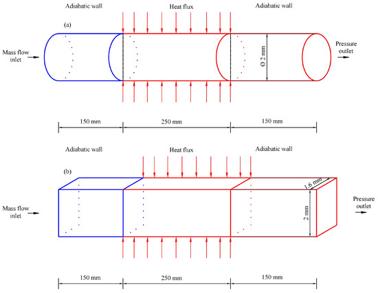 A 2D axisymmetric swirl model and a 3D model were adopted for the uniformly heated horizontal circular and rectangular tubes (Figure 1). Due to the symmetry of the rectangular tube, a quarter of the computing domain was used. The axisymmetric swirl model was adopted because of the axial symmetry of the circular tube. The heated section length was 250 mm, and a 150 mm long insulation section was added at both the inlet and the outlet. With reference to the experimental data provided by Zhou et al. [17], the and inlet temperature of n-decane in our simulation were set to 0.8 g·s−1 and 673.15 K, respectively. At the outlet, a pressure outlet boundary was applied, where the pressure was specified at 3.5 MPa. The qw of the heated wall was 0.48 MW·m−2. The walls of the inlet and outlet unheated sections were all treated as adiabatic. All the walls in the models were nonslipping. From Figure 1, the only difference between the two computational domains lay in the geometry of the cross section.