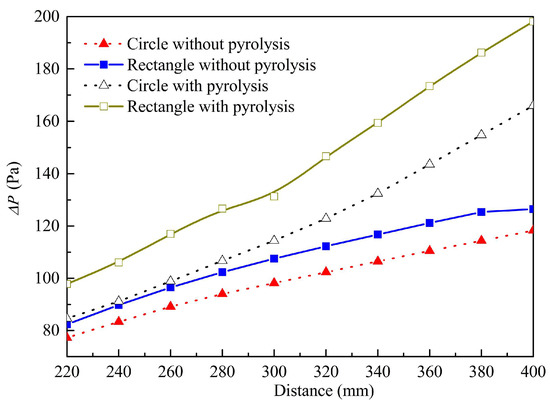 Figure 5 indicates that the pressure drop (ΔP) increases gradually along the circular and rectangular channels. However, the flow resistance in the rectangular channel (R) is greater than that of the circular one (C). According to Equation (19), the equivalent diameter (1.78 mm) of the rectangular channel is smaller than that (2 mm) of the circular one. Therefore, the flow resistance in the rectangular channel is greater than that of the circular one. From Figure 5, when the cracking reaction model is adopted in the simulation, the pressure drops in both the circular and the rectangular tubes increases. The mean pressure drop per 20 mm long circular tube increased from 99 Pa to 122 Pa, while the mean pressure drop per 20 mm long rectangular tube increased from 108 Pa to 144 Pa. Therefore, the mean pressure drop in R is 1.18 times as high as that in C with pyrolysis.