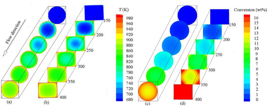 Figure 7c shows that the conversion in C gradually increases from the center to the tube wall and from the inlet to the outlet, which is consistent with the trend of temperature change, as shown in Figure 7a. From Figure 7c,d, the area of the high-conversion region in the rectangular tube is much larger than that in the circular tube, which is mainly due to the distribution of the temperature boundary layer in the rectangular tube, as shown in Figure 7b. From Figure 7d, the pyrolysis in the corners of R has a higher conversion, which may enhance coke deposition rates. Similar expressions were observed in [15].