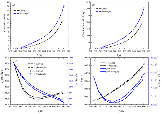 Variations in (a) conversion, (b) chemical heat sink, (c) cp and ρ and (d) λ and μ with the Tf in the circular and rectangular tubes.