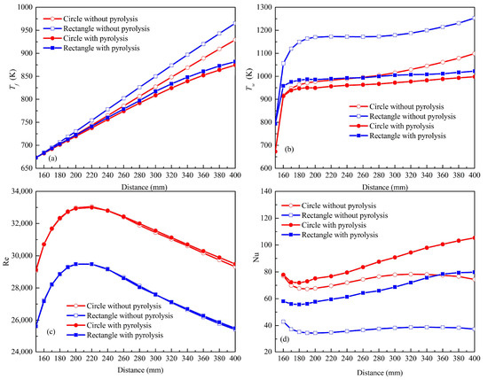 Figure 9 indicates the distributions of the Tf, Tw, Re number and Nu number with the circular and rectangular tubes. From Figure 9a,b, the Tf increases gradually, while the Tf and Tw in C are lower than those in R. When the fuel cracking reaction model is included in the simulation, both the Tf and the Tw decrease in the circular and rectangular tubes, which indicates that the endothermic fuel pyrolysis improves the convective heat transfer by decreasing the bulk fluid temperature and increasing the flow velocity. In addition, the difference between the Tw and the Tf at the outlet of rectangular tube is 140 K, which is 17 K more than that of the circular tube. The heat transfer from the wall to the main flow is weakened by the thickening of the heat boundary in the initial heating section. Therefore, the Tw increases sharply at the initial heating section.