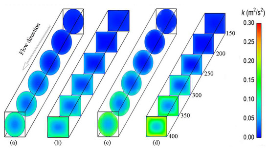 Cloud plots of turbulent kinetic energy in the circular and rectangular tubes (a,b) without pyrolysis and (c,d) with pyrolysis.
