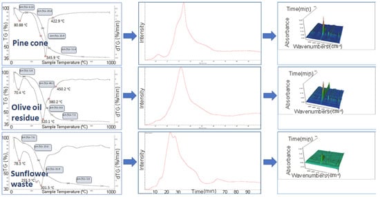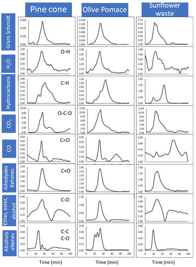 All biomass samples display noticeable chemigrams for CO2, CH4, and H2O, as can be seen in Figure 5. The C-H vibrations of CH4 evolution are detected between 19 and 74 min for pinecone pyrolysis as a single and wide-range peak. In contrast, sunflower waste produced CH4 between 14 and 57 min with a two-step degradation. The first small peak at 18. minutes (~200 °C) is explained by the initialization reaction, and the second main peak at 43 min (~450 °C) is due to the final decomposition reactions of the holocellulosic fraction. These temperatures are in agreement with the TGA data (Table 4) and previous studies [58,62]. The release of aldehydes and/or ketones starts at 23, 20, and 14 min for pinecone, olive pomace, and sunflower, respectively. In addition, the chemigrams illustrated for the wavelength between 1085–960 cm−1, which are assigned to C-O stretching vibrations of alcohols and C-C stretching vibrations of alkenes, are viewed for all samples at different temperatures. All these differences in the evolved gas profiles demonstrate the effect of compositional differences in the samples and also the inexplicable synergetic effects of the combination of these natural polymers with inorganics arising from the ash content of biomass.