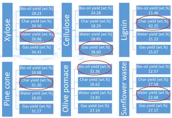 The pyrolysis product yields of selected biomass samples are also given in Figure 6. Olive pomace yielded the highest amount of bio-oil (32.36 wt.%) when it is compared to other biomass samples. The lignin content of olive pomace was quite high, and hence lower bio-oil formation was expected due to the pyrolytic behavior of lignin, as explained above. However, the significant amount of n-hexane soluble oil content of olive pomace resulted in the condensable volatile formation through the possible complex reactions between -oic acids (mainly oleic acid) in the oil and lignocellulosic constituents. A woody plant—pinecone—had the lowest bio-oil yield of 18.88 wt.% and the highest char yield of 31.20 wt.% among the biomass samples. The lignin content of this forestry residue resulted in more charring reactions and, consequently, a high amount of char at the end of pyrolysis. Sunflower waste was characterized by its relatively high holocellulose content; therefore, the bio-oil and considerably high water yields were calculated to be around 22.6 wt.% and 22.7 wt.%, which lie in the range of agricultural waste pyrolysis yields [72,73]. Although the lignin content of sunflower waste was approximately 20 wt.%, the char yield was calculated to be close to that of olive pomace, which contained approximately 50% more lignin than sunflower waste. The reason for this elevated char yield could be explained by the ash content of sunflower waste. When compared to other samples, sunflower waste had the largest amount of inorganic content (ash) with 11.2 wt.%, and accordingly, the calculation using Equation (5) generated a higher char yield.