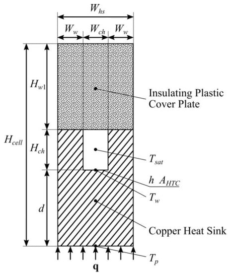 Tsat is the water saturation temperature at the thermocouple location, Wch is the micro-channel width, Hch is the micro-channel height, Whs is the width of the heat sink unit cell, η is the fin efficiency, k is the copper heat sink thermal conductivity and q is a constant heat flux calculated using input electricity supplied to the heaters. It should be emphasized that h cannot be determined explicitly from Equation (5) because the fin efficiency η is a function of h.