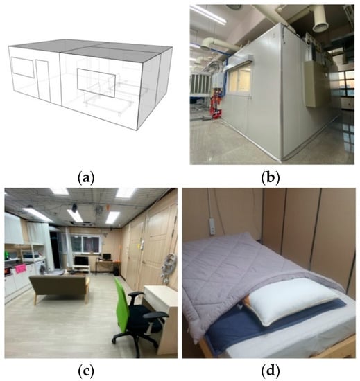 Pictures of the Smart Living Testbed: (a) perspective view; (b) outside view; (c) living room; (d) bedroom.