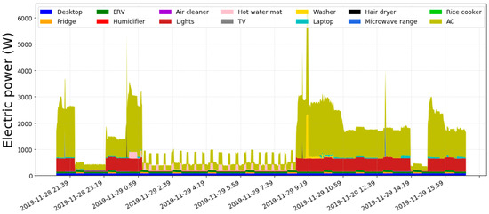 Based on the collected indoor video data, a dataframe type of occupant location dataset was constructed to be used as an input variable for an advanced energy disaggregation model. In this process, the image data were captured every second and converted to the time series occupants’ location data. Figure 4 shows an example of electric power data by 14 appliances from the Smart Living Testbed.