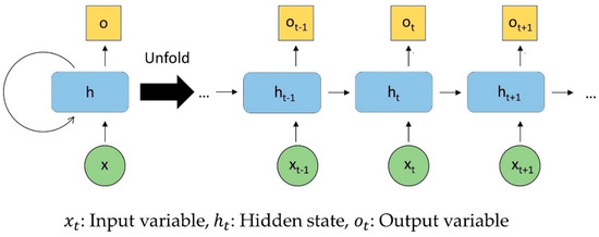 Figure 5 shows the structure of a recurrent neural network in which a memory cell is in the concealed layer that can store the previous values, and the task of sending the current and previous information, hidden state, to the hidden layer at the next point is repeated. As these procedures become longer and the internal structure becomes more complex, there is a limit due to the problem of the vanishing gradient. In addition, this repetition has a limitation in that the problem of long-term dependencies, in which historical information stored in the hidden layer, is not delivered to the end. More details can be found in [41].