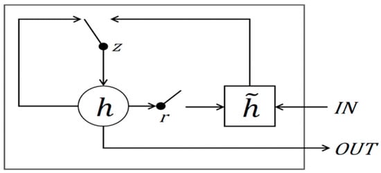 A gated recurrent unit (GRU), proposed by Cho et al., is a strain algorithm that complements the shortcomings of a basic RNN [43]. The GRU consists of a relatively simpler structure than the LSTM. The LSTM consists of a total of three gates (i.e., the forget gate, the input gate, and the output gate), while the GRU consists of two gates (reset gate:r and update gate:z), where the role of the port gate is divided into the remaining two gates, as shown in Figure 7. These gates are vectors that determine the information to forward. The reset gate decides how to combine the previous memory with the new input value, and the update gate determines how much of the previous memory is to be delivered.