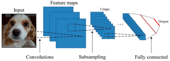 A convolution neural network (CNN) is a class of deep neural networks most commonly applied to visual image analysis. A CNN is composed of the input and output layers and several hidden layers like normal neural network algorithms [44]. The hidden layers of CNN are composed of convolutional layers, pooling layers, and a fully connected layer. The convolutional layer has a convolution filter and a nonlinear activation function. The convolution filter is a common parameter to find the features of the input data. This is usually composed of a square matrix and creates a feature map through the convolution operation. After the convolution operation, a nonlinear activation function is applied to the feature map [45]. In the pooling layer, the dimension of the feature map is reduced, and the noise of the input data can be decreased by this operation. After the pooling operation, all feature map values are connected to the input nodes of the fully connected layer [45], as shown in Figure 8. CNNs with these characteristics are used in various fields including image recognition and classification and natural language processing.