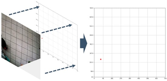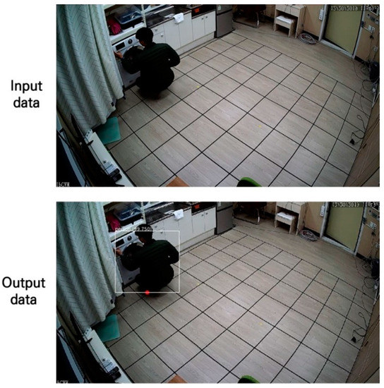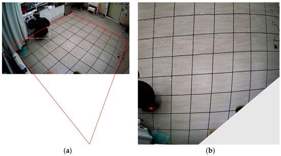 In addition, a process of perspective transformation of the image was performed using OpenCV (Open Source Computer Vision). OpenCV is a programming open source developed by Intel for real-time computer vision. A point from the output image in Figure 9 was used to estimate the location of an occupant. Therefore, it is necessary to perform perspective transformation and planarization based on the bottom surface of the output image. As the perspective transformation is based on four vertices, it is necessary to designate the vertices of the floor surface. In the case of images used in this study, there was a limitation that all floor surfaces in the living room were invisible due to the camera angle. Therefore, the perspective transformation was performed by estimating the position of one vertex based on the grid on the floor. Figure 10 is an example of the result of this perspective transformation.