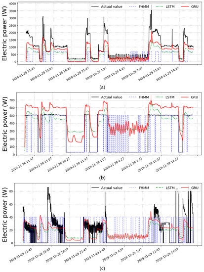 Figure 12 shows the electric power disaggregation results from three algorithms for four representative devices (air conditioner, lights, laptop, and hot water mat). As can be seen from the graph, since the FHMM-based disaggregation model has a characteristic of inferring the electric power (W) at the time of operation with a specific value, it tends to show a rectangular pattern. Therefore, in the case of an appliance such as the lights in Figure 12b, it is advantageous to infer the electric power consumption. However, in the case of a multistate appliance such as an air conditioner in Figure 12a, the inferred accuracy from FHMM is very poor. In contrast, the RNN-based disaggregation model (LSTM and GRU) can learn the electric power patterns that change over time, thus showing better performance for the electric power relatively well compared to the FHMM.