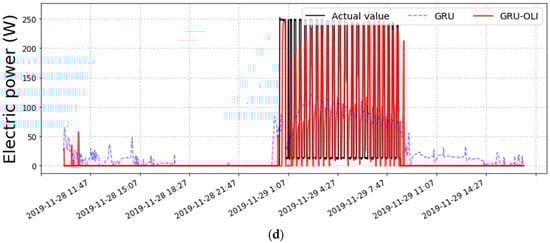 Table 7 shows the results of the disaggregation of the electricity consumption by adding the case of the GRU-OLI disaggregation model to Table 4. The GRU-OLI model showed excellent performance in inferring the electricity consumption in 11 out of a total of 14 appliances (appliances other than a rice cooker, microwave range, and hair dryer), which were most similar to the actual values. In the electric power inferring performance results by the minute, as shown in Table 8, the inferring performance when using the occupant location information was improved by 50% for the MAE and 37% for the RMSE compared to the model without the location information.