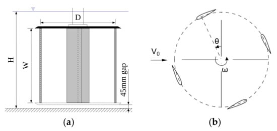 Figure 2a, has a diameter of D = 400 mm and a wingspan of W = 400 mm. The 4 straight blades are based on a NACA0015 section of c = 80 mm chord. Each of the blades is attached at its ¼ chord and tangent to the rotor perimeter. The rotor is driven in rotation by a servomotor and is equipped with torque and angular position sensors. The blockage ratio associated with the turbine front area is defined as b = DW/BH. For the range of water levels used in this study, its value varies from 21% to 29%.