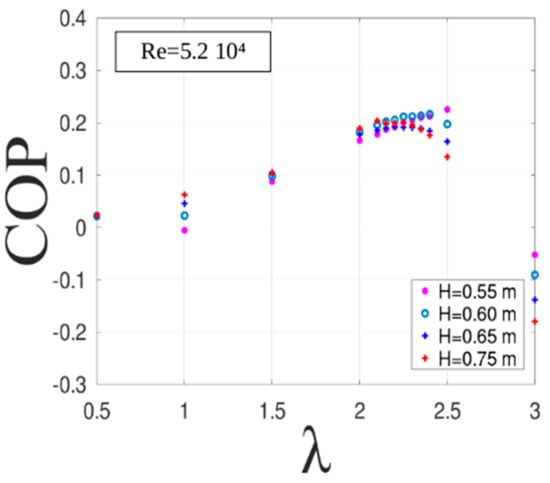 The flow confinement occurring for the lowest water depths results in a slight increase in the COP, from COP = 0.2 to 0.22, with a significant displacement of the optimal operating point towards higher advance parameters. A remarkable feature of these COP characteristics concerns the influence of the water level for varying advance parameters. For a TSR significantly below the optimal (λ = 1 to 2.2 here), a higher water level leads to a higher COP. This trend is then reversed as the TSR reaches, or passes (for H = 0.65), the optimal operating point. In other words, the water turbine is more efficient at low TSR in deep water and at high TSR in shallow water. It can also be observed that the COP slope is steeper at a low water level and low TSR, making the operational range of the turbine more selective in shallow water than in deep water.