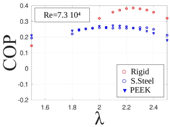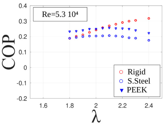 At the higher Reynolds number, the COP curves of the two free-ended turbine models become similar; however, a still slightly higher COP of up to λ = 2.2 is obtained when flexible blades are used. Conversely, for the highest advance parameters, rigid blades offer better performance as the COP values are less subject to decreasing.