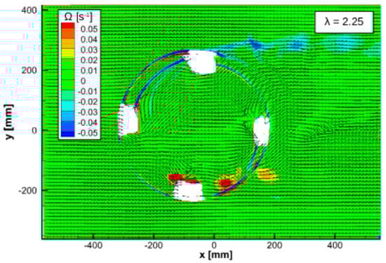 Figure 11 at azimuth 225° for the 3 advance parameters surrounding the optimal operation point. The differences in flow topology between these operating conditions are tenuous, with apparently identical vortex kinematics, yet the COP is lowered by nearly 7% for λ = 2.25 ± 0.15. In this respect, the results of Gorle et al. [