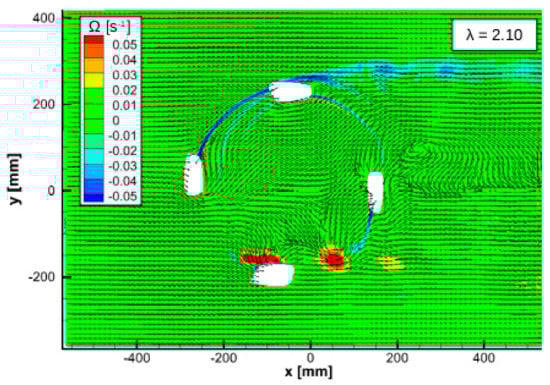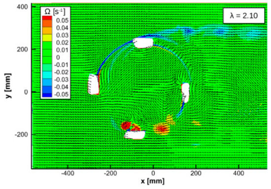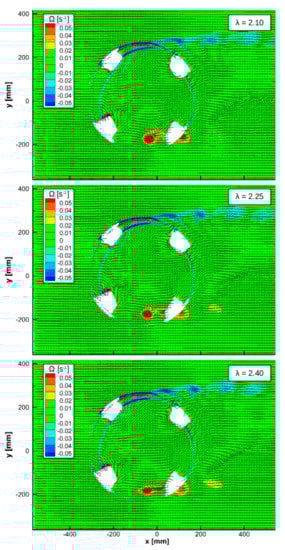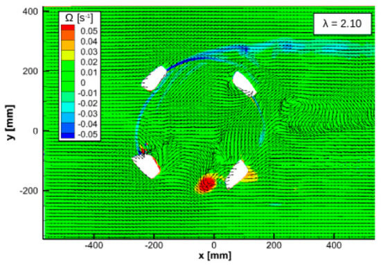 Figure 11, the 2 counter-clockwise vortices surrounding the θ = 225° blade illustrate this competition between induced forces and impingement. For λ = 2.10, the blade–vortex interaction is almost nonexistent. For λ = 2.25, the interaction starts to establish, and it strengthens at λ = 2.40. Up to the optimal advance parameter, the blade tends to approach closer to the downstream vortex, gradually maximizing the propulsive torque. At higher λ, the de-structuring effect of the interaction limits the beneficial effect of the induced load.