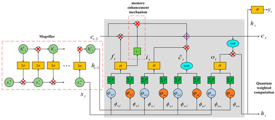 The structure of Mogrifer-QWMELSTM neural network forecasting model constructed in this paper is shown in Figure 2. Compared with the conventional LSTM neural network, the basic structures such as the forget gate and input gate remain unchanged. The model is improved in two aspects: model structure and model composition. In terms of model structure, there are two improvements. First, the mogrifier is added to make and complete interaction and update before making relevant calculations. This addition can help enhance the correlation between the front and rear data, and improve generalization ability of neural network. Second, the memory enhancement mechanism is added on the forget gate to realize the extraction and recovery of forgotten information. This addition can help improve the gradient transmission ability in the learning process of the neural network, make the neural network remain sensitive to distant data information, and enhance the memory ability. In terms of model composition, the model is composed of quantum weighted neurons. Compared with conventional neurons, they have significant advantages in nonlinear data processing and parallel computing, which is helpful to enhance the generalization ability and nonlinear approximation ability of neural network.