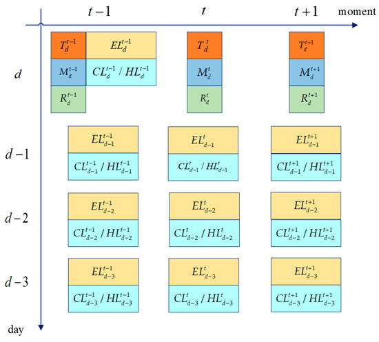Characteristic quantities of the input are shown in Figure 3, divided into weather data and historical data. The weather data include three kinds of weather factors at the moments t − 1, t and t + 1 on the forecast day. The historical data include the historical loads at the moment t−1 on the forecast day and at the moments t − 1, t, t + 1 on the day before the forecast day. All input data need to be normalized.