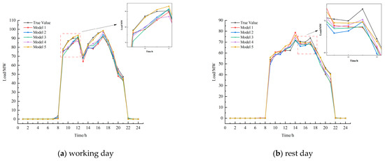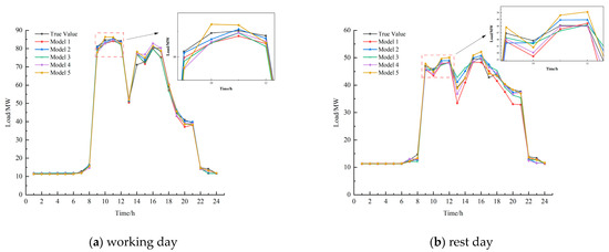 Comparison of electrical load forecasting curves of five models in summer. (a) Electrical load forecasting curves of five models on working day in summer; (b) Electrical load forecasting curves of five models on rest day in summer.