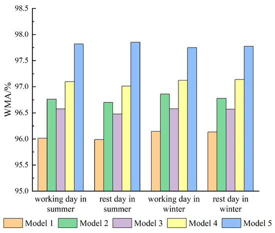 In order to verify the stability of the model proposed in this paper, seven typical days in winter are selected for forecasting. The results are shown in Table 5. The WMA of the proposed model in these seven days is over 97.5%.