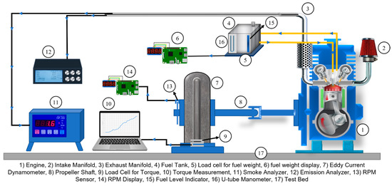 A single-cylinder agricultural, water-cooled diesel engine with a power rating of 7.4 kW was used for experimentation, and the experimental setup is shown in Figure 1. Daedong Ltd. was the maker of the CI engine. The fuel injection system was mechanically controlled, with the indirect injection having an injection pressure of 135 kg/cm2. Fuel and air were premixed in a premixing chamber just outside the cylinder. The experiment was conducted at the Automotive Engine Combustion and Alternative Energy Lab at Kongju National University, Cheonan campus. The study took place under two different load conditions (50% and 100%), with the engine speed between 1200 rpm to 1800 rpm with 200 rpm increments. Table 3 illustrates the engine specifications used in the study. The power rating of the engine was measured using an eddy-current dynamometer. Fuel was measured using a load cell, and the measurements were confirmed with the help of a U-tube manometer.
