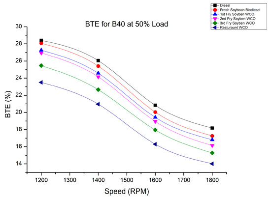 BTE of fry biodiesel B40 blends at various speeds at 50% load.