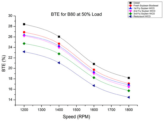 BTE of fry biodiesel B80 blends at various speeds at 50% load.