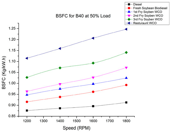 BSFC of fry biodiesel B40 blends at various speeds at 50% load.