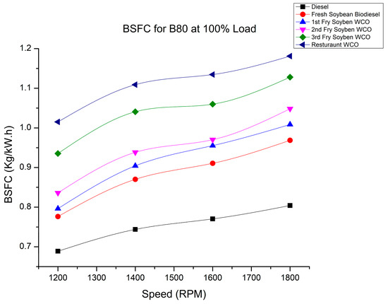 BSFC of fry biodiesel B80 blends at various speeds at 100% load.