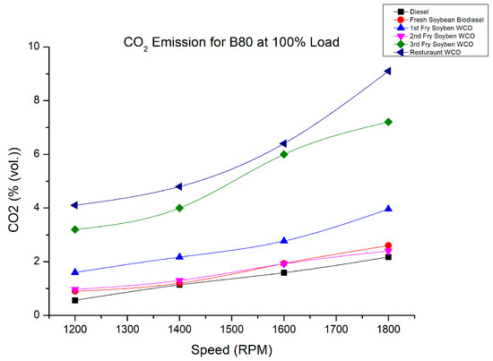 It was observed that there was a rising trend for CO2 emissions. Diesel recorded the lowest CO2 emissions compared with biodiesel fuel. Considering that biodiesel contains higher oxygen than conventional diesel, the relationship of higher CO2 with this fuel could have been a possible reason. During combustion, oxygen interacts with the unburned carbon atoms, causing more CO2 to be produced. As the frying time of the oil increased, CO2 emissions also rose. This was due to the fuel’s higher density and heating value, which relied on the mixing ratio and the frying number of the oil. Due to the fuel’s incomplete burning at a faster rate, it generated higher CO2 emissions [33,43].