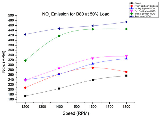 NOx emission of fry biodiesel B80 blends at various speeds at 50% load.