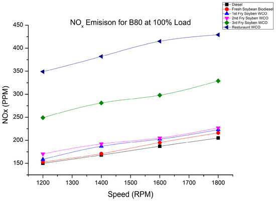 NOx emission of fry biodiesel B80 blends at various speeds at 100% load.