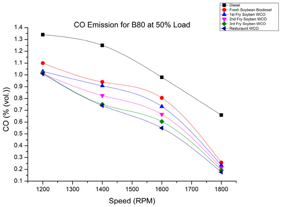 CO variation of fry biodiesel B80 blends at various speeds at 50% load.