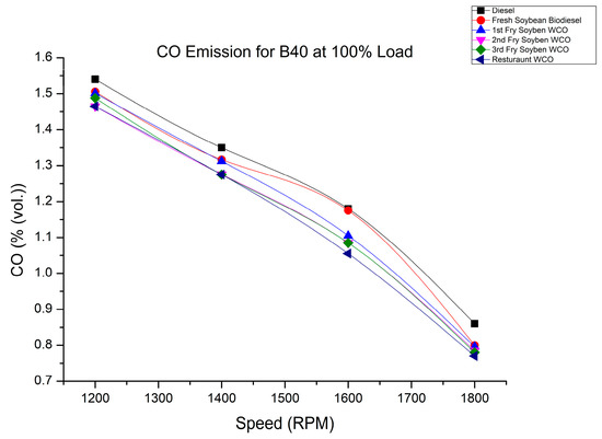 The lower CO emissions of biodiesel blends were because of the higher oxygen content of biodiesel, which, in turn, helped with the complete combustion of the fuel. As such, the CO emissions decreased when using the biodiesel blends [33,34].