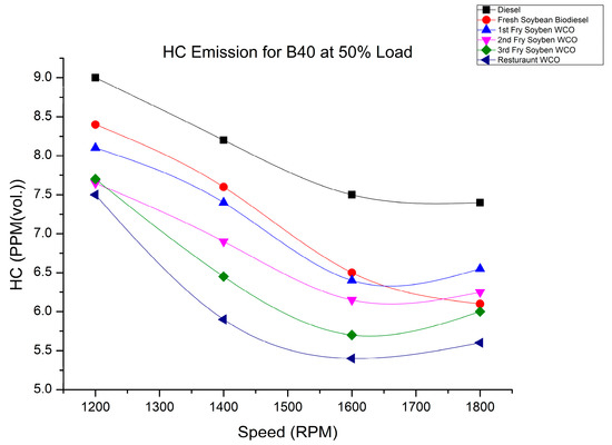The reason for higher HC emissions can be correlated with the short ignition delay due to the higher cetane number of biodiesel compared with other biodiesel fuels. The observed HC emissions had a lowering trend relative to diesel fuel, which was because of the higher oxygen content in the biodiesel fuel blends. A higher oxygen content leads to lower HC [22,33].