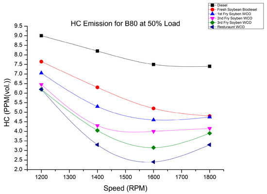 HC variation of fry biodiesel B80 blends at various speeds at 50% load.