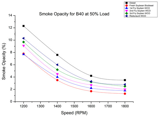 Smoke variation of fry biodiesel B40 blends at various speeds at 50% load.