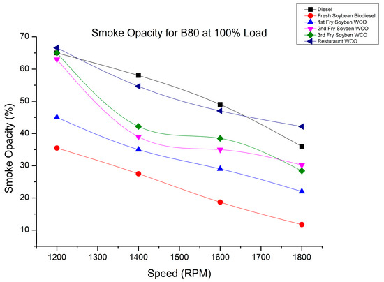 Smoke variation of fry biodiesel B80 blends at various speeds at 100% load.