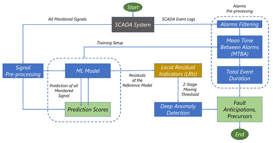 The first operation proposed in the framework is the pre-processing and cleaning of SCADA event logs and signals, filtering out minor events from the logs and removing constant signals (see Section 3.1).
