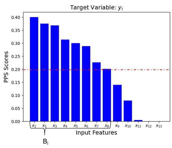 where is the Mean Absolute Error of the chosen regression model that predicts from a candidate , while is obtained with a naive model that always predicts the median of . The index ranges from 0 (no predictive power) to 1 (perfect predictive power). On this basis, as suggested by the authors of the algorithm [37], the minimum PPS acceptability limit is consistently set at 0.2. For each specific target variable (), a vector of best predictors Bi is defined, selecting from the set of all possible input features (), the ones with a PPS score above the set threshold. For example, as highlighted in Figure 2, for the specific target variable () the vector of best predictors Bi includes the subset of input features ranging from to .
