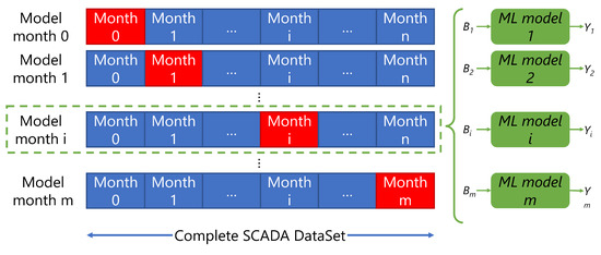 In detail, as shown in Figure 3, one month m is cyclically isolated as the testing dataset Dtest, and a model is trained on the remaining months split between training Dtrain and validation Dval datasets. This approach is meant to avoid possible overfitting and presume that most of the operational data over a long period of time refers to normal engine operation. To further reduce the possible presence of failure precursors in the reference model, Dtrain does not include any downtime period, considering an additional safety time range equal to the value of the MTBA index obtained at the pre-processing stage.