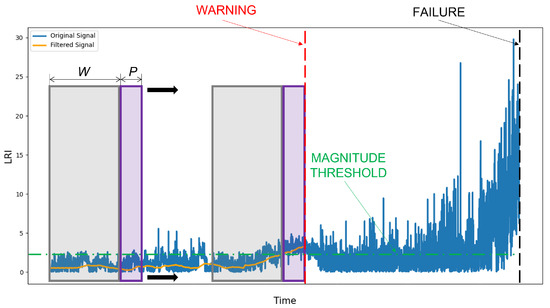 Additionally, the is enhanced with a sliding threshold metric based on an average obtained with a rolling-window algorithm. This is done to trigger early warnings while limiting the occurrence of false alarms due to spikes. In particular, as shown in Figure 4, an alarm is triggered for a signal when the following condition is satisfied for P consecutive time steps:
