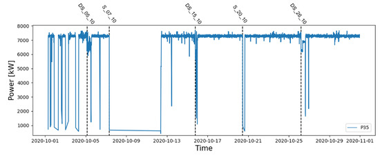 The advances found before the emergency stops on 7 October 2020 (event ID: S_07_10) and 20 October 2020 (event ID: S_20_10) are of particular interest since they are not associated with a specific SCADA anomaly alarm on a component of the gas genset. In correspondence to these unscheduled downtimes, both ML models showed an anomaly on the LRI of cylinder temperature (P08), which caused a warning three days in advance of the first event (84 h for XGBoost and 62 h for MLP). Subsequently, the indicator of parameter P08 returned to normal values after the maintenance intervention, as visible in the active power plot in Figure 5), and then deviated again from 16 October 2020 (see Figure 6 and Figure 7) until the emergency stop on 20 October 2020.