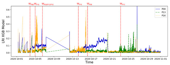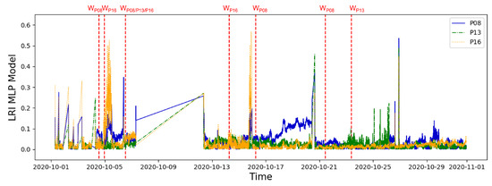 Furthermore, while the warning on the S_15_10 event was triggered by the two models at the same time, the MLP model detected the anomaly related to event DS_05_10 about ten hours earlier than XGB. The third derating event followed by an engine shutdown was recorded on 26 October 2020 (event ID: DS_26_10) and concerned a high-temperature alarm on cylinder 5B (P13) detected on the same day. Furthermore, for this event, Figure 6 and Figure 7 present a significant variation of the LRI for the parameter P13, constituting a specific precursor that results in a warning both for the MLP and XGB models on 23 October 2020, about three days in advance compared to the SCADA alarm.