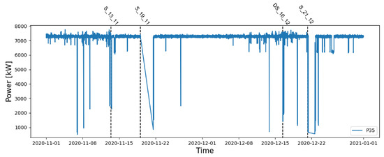 Active power for the period of November and December 2020, with details on the SCADA events recorded in that period (black dashed line).