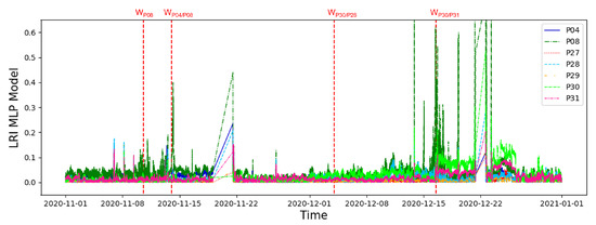 In particular, XGBoost LRIs (Figure 9) highlighted, on 4 December 2020, a variation in the three temperatures of the generator-related variables, phases and bearings (P27-P31). This resulted in a warning that anticipates the SCADA log DS_16_12 by about twelve days. Comparing these results with those of the MLP model (Figure 10), the same significant deviation was not noticed on the generator stator winding but only on the two generator bearings.